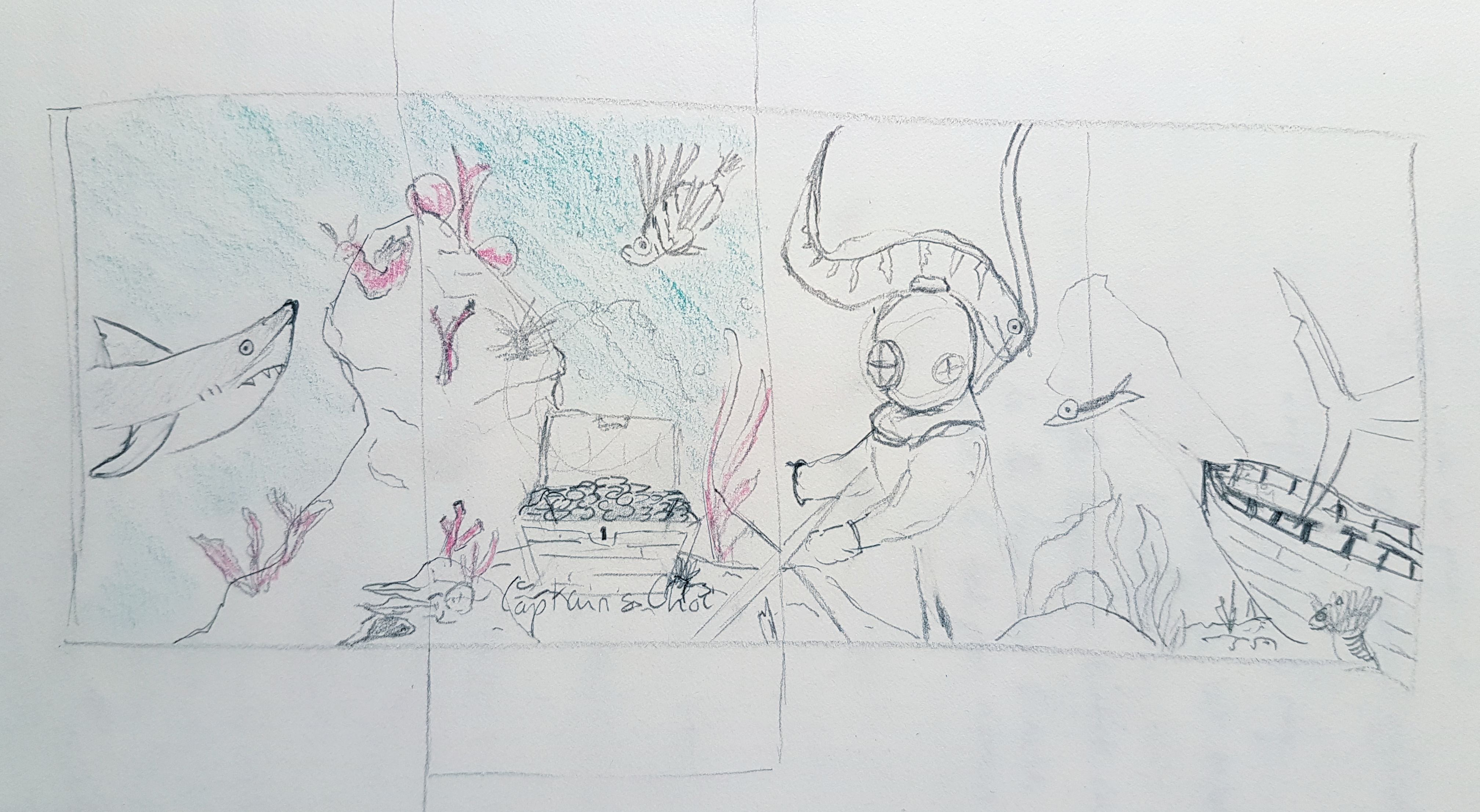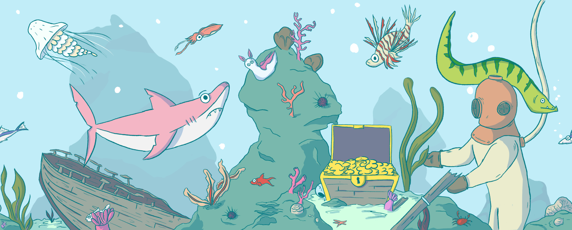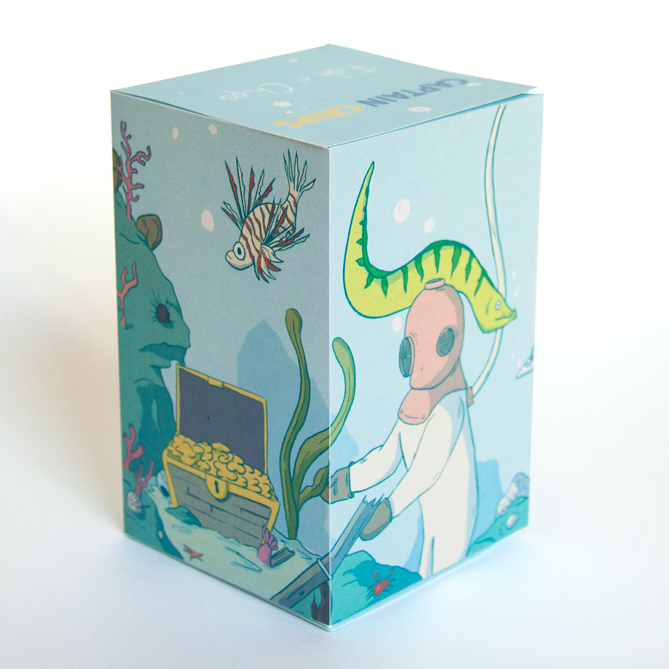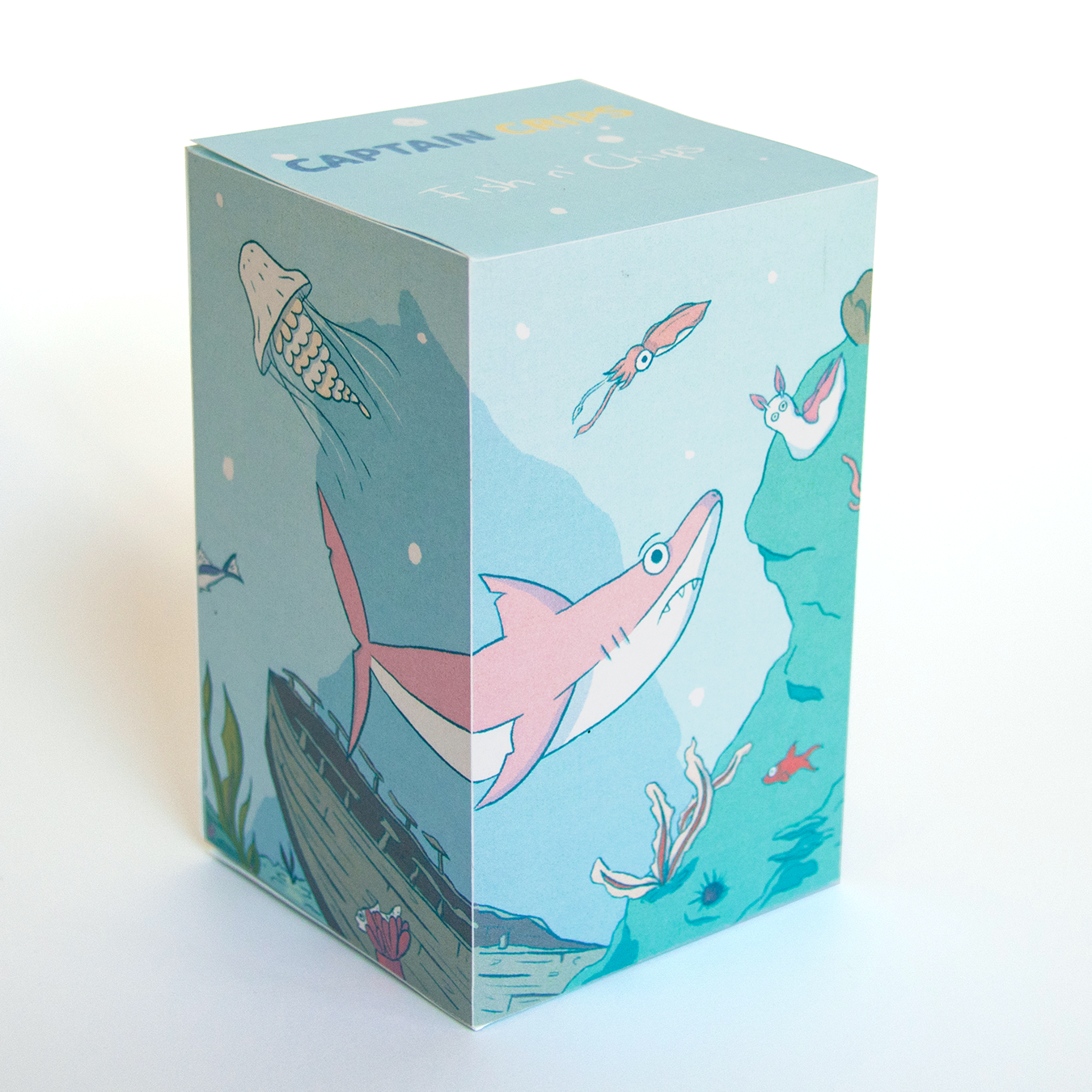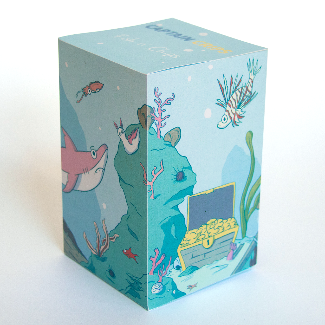 The brief was to create an illustration for a simple box. The illustration had to go around each face of the box. I invented an imaginary fish and chips brand, and illustrated this marine scenery for it.