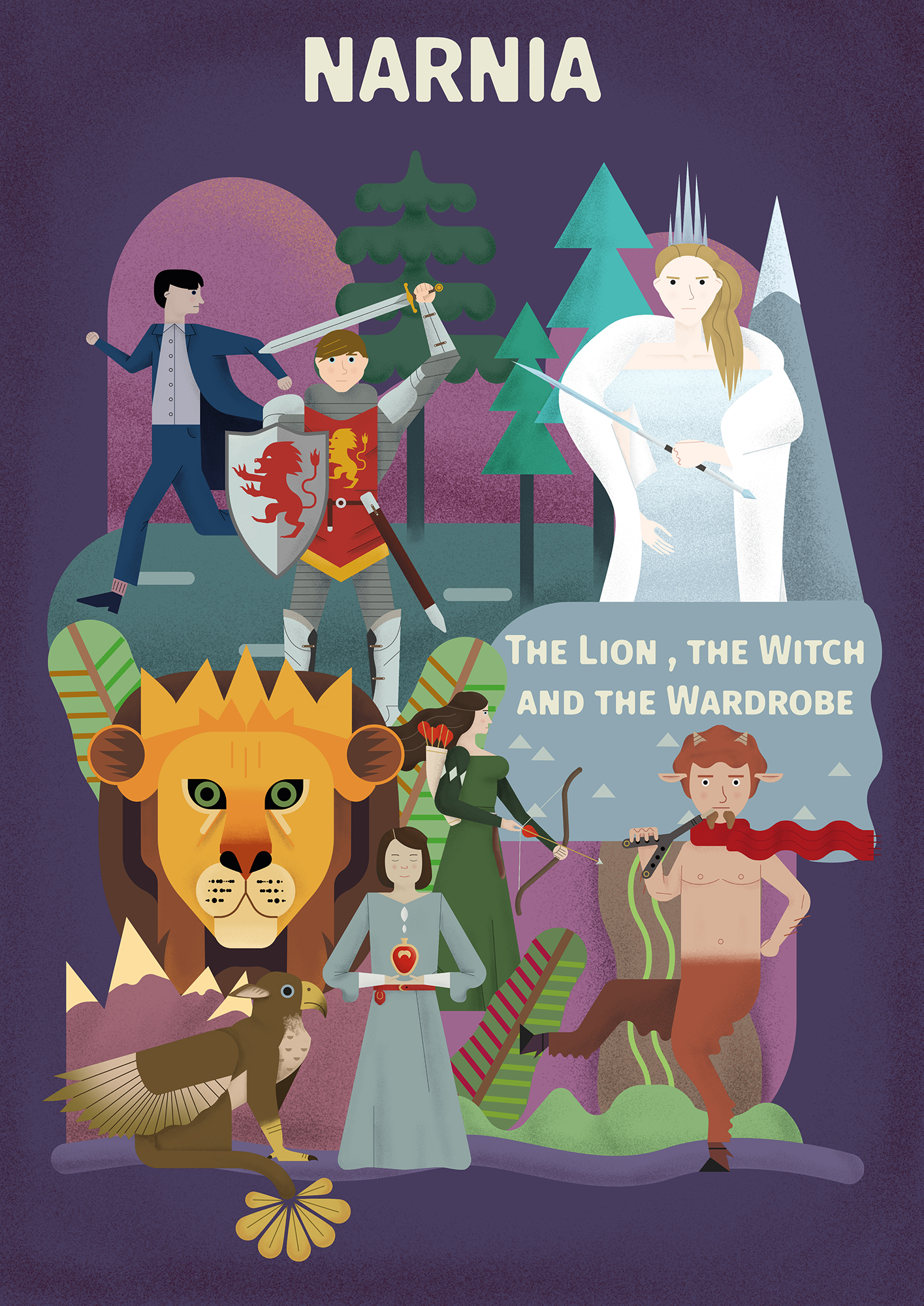 Narnia has always been a universe I’ve enjoyed, and I decided to recreate a poster for the first movie, The Lion, the Witch and the Wardrobe. The composition tells the story of the movie, with Edmund running away from the Witch, Peter fighting her, the colors getting colder the closer they are to the Witch, etc. You can see down below each character present on the poster. Initially the minotaur was supposed to be there too, but he didn’t fit well and didn’t make it into the final composition. This project was made with Illustrator and Photoshop.