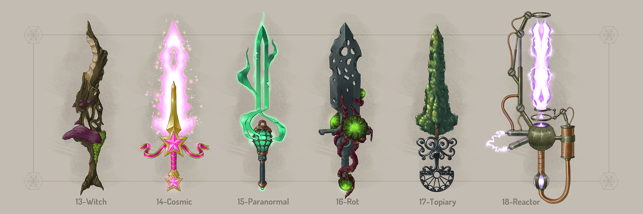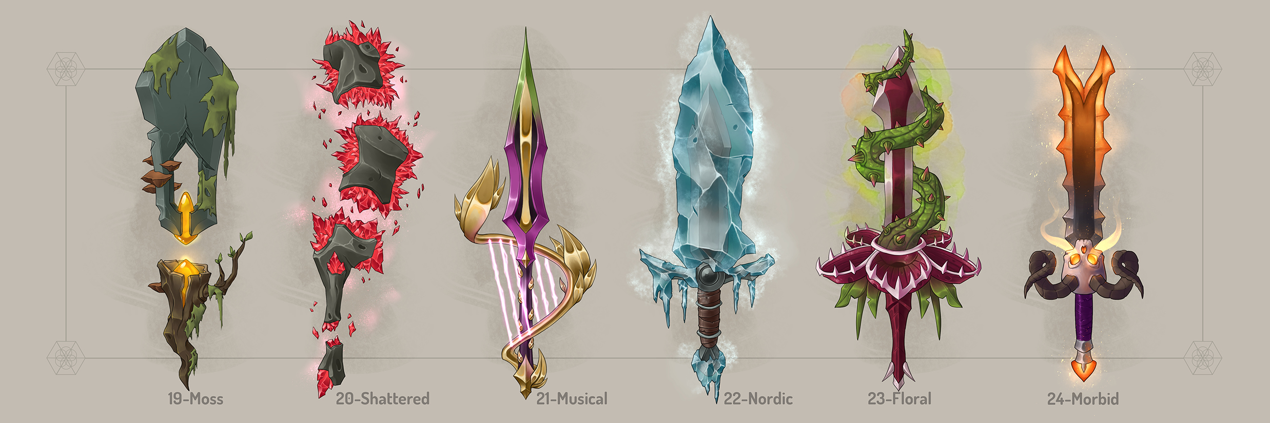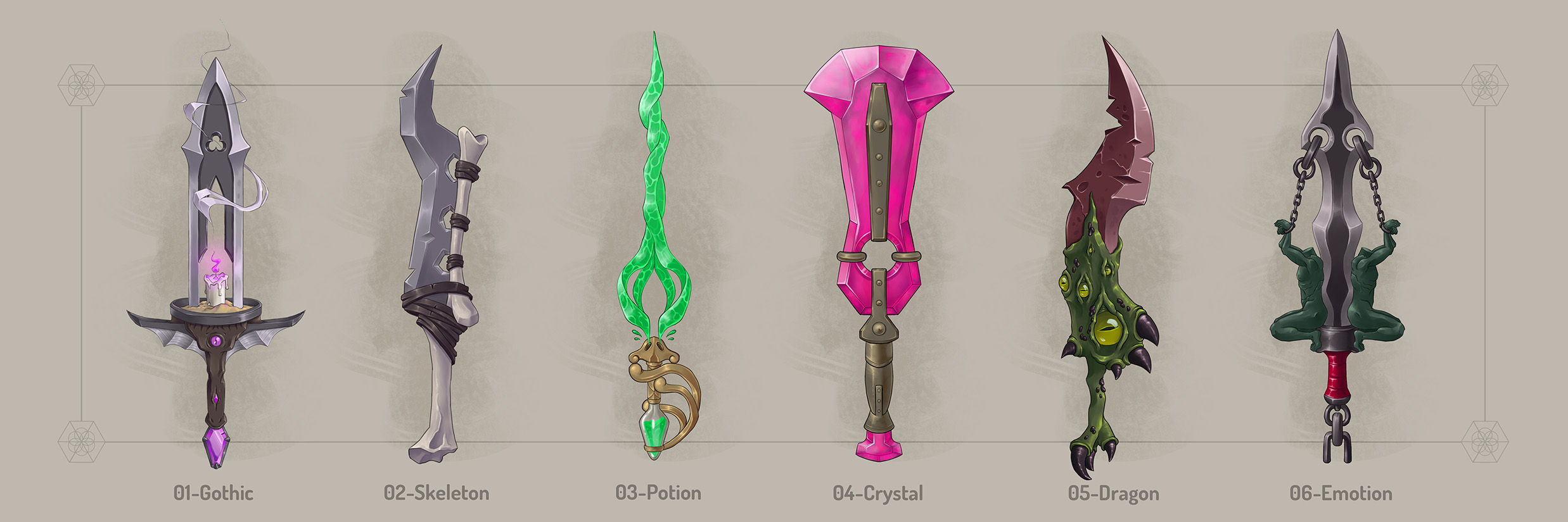 Swordtember is a drawing challenge taking place in September. During this challenge the artists follow a list of words created by another (or several) artist(s). One drawing a day, 30 drawings by the end of the month. I participated in 2023 following different lists by artists that inspire me. I took this opportunity to learn as much as I could about painting various materials and textures, as well as creating visually appealing designs. I didn’t focus much on functionality and rather went for fun designs that could be cosmetics for games.